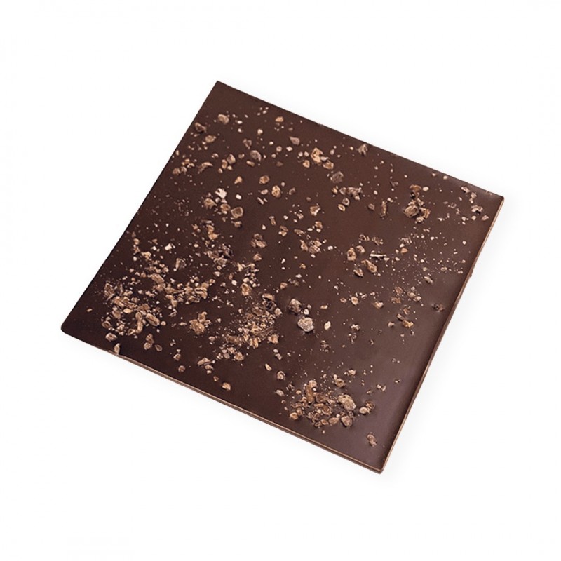 Tableta de Chocolate con leche y con Nibs (100% Cacao tostado y triturado) aportando un toque crujiente.
