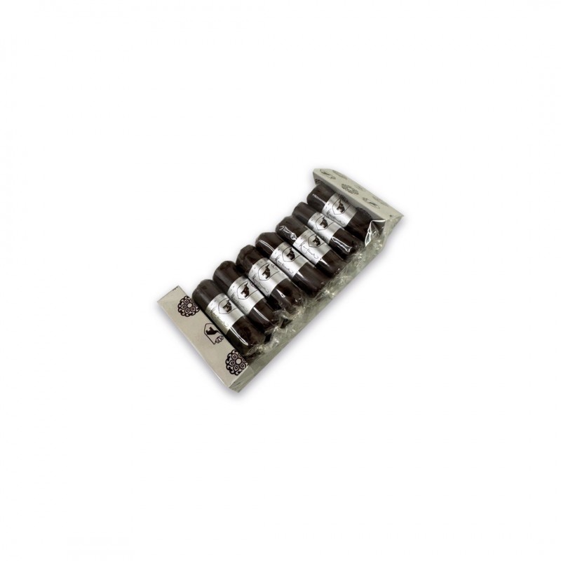 Crujiente barquillo relleno del más auténtico praliné y recubierto con chocolate negro (mínimo 60%), envueltos individualmente en celofán y nuestra vitola del "elefante".