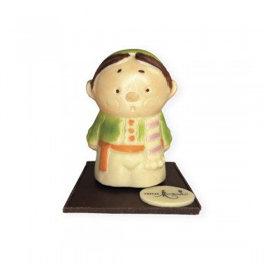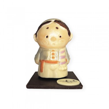 Figura de Fallero en chocolate blanco y negro con toques de color, decorada a mano, sobre base de chocolate negro. Presentación en caja transparente con cinta. Tamaño: 10 cm. altura aprox.