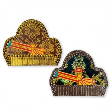 Figura "Peineta de Fallera" elaborada en chocolate blanco y negro con toques de color y chocografía. Réplica tamaño real. Presentada en caja transparente con cinta decorativa.