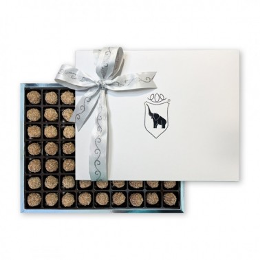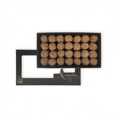 Presentación: Caja Isotérmica con 28 trufas clásicas, para preservar durante dos a cuatro horas aproximadamente de la temperatura exterior, hasta ponerla en frío (5ºC - 8ºC aprox.), y una vez en nevera, abrir siempre la caja para que, con dicha temperatura, recupere la textura y sabor idóneo.