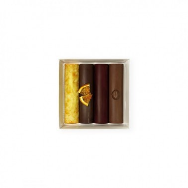 Caja de 4 unidades de Tentaciones de chocolate negro, chocolate con leche y chocolate blanco, con varios tipos de pralinés.