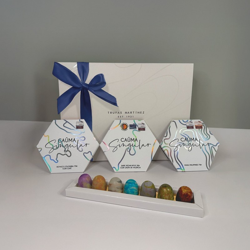 Se acompañan de tres tabletas Cauma Cacao Singular, chocolates de origen único y premiados internacionalmente en los European International Chocolate Awards, que destacan por notas de cata muy distintas entre cada una.